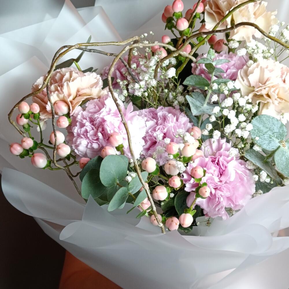 Букет креативной студентке 🔥 из диантусов с гиперикумом и гипсофилой в Грязовце